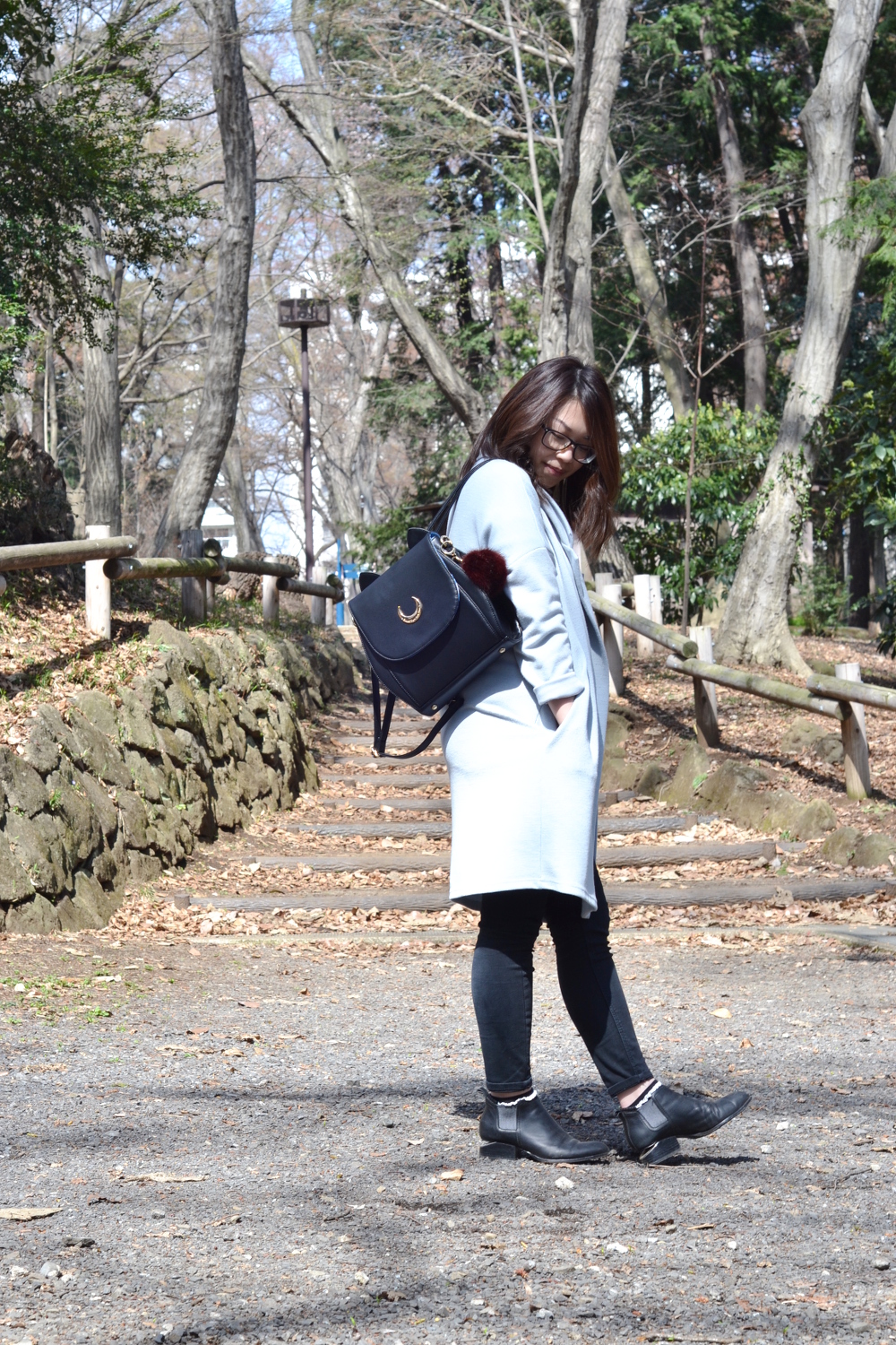 I wore my failsafe turtleneck and top combo, of course. I’m seriously obsessed with this knitted vest, the tiny peplum hem makes it super girly. Of course I couldn’t traipse around Tokyo without my pastel blue duster in tow! It truly helps to set the springtime mood, don’t you think?