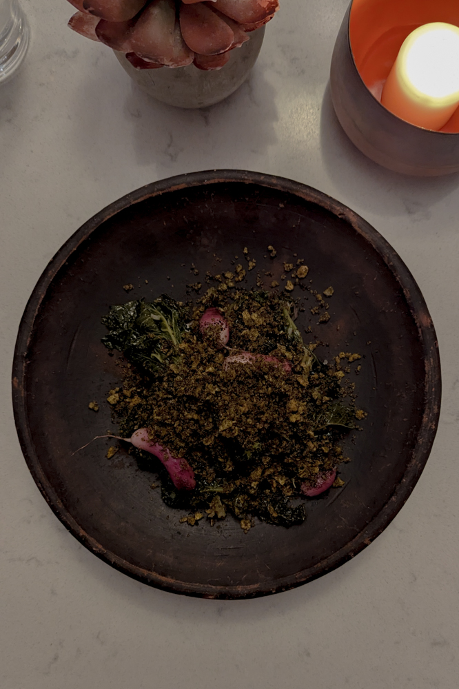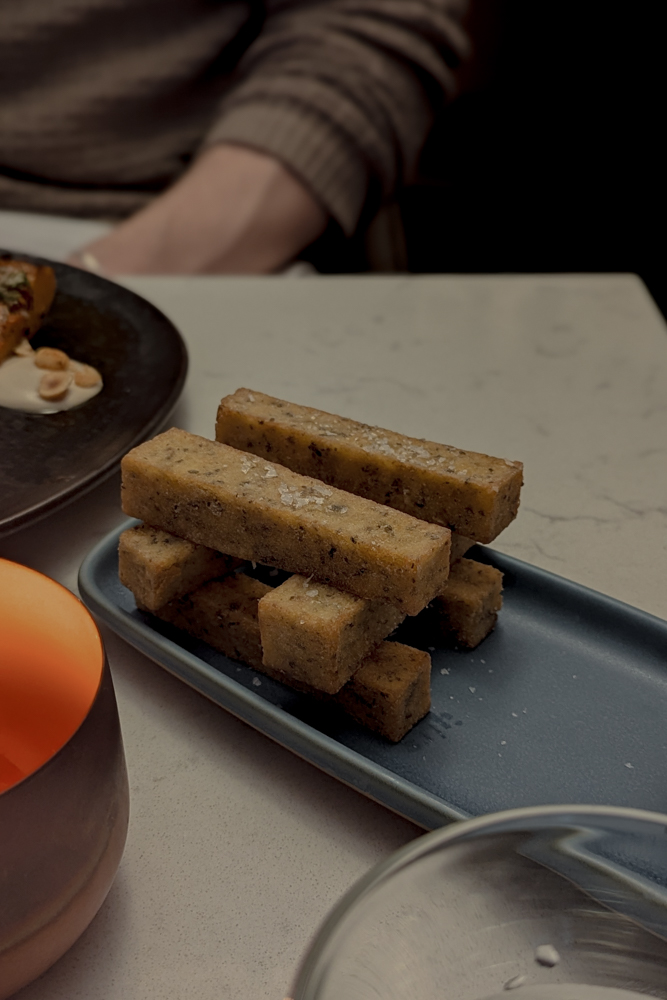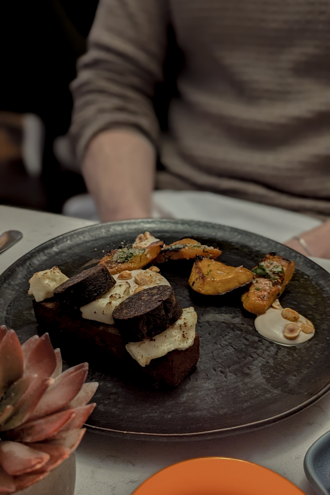 Our mains were utterly delicious! I went for the Saffron Kohlrabi and have been dreaming of eating it again ever since. Kohlrabi is a German turnip cabbage, and was perfectly dressed amongst braised savoy cabbage and gloriously sweet-and-sour Romanesco. The salty crunch from the schupfnudeln – a German potato noodle – was the pièce de résistance, though. So moreish. My boyfriend ordered the Charred Butternut Squash, which looked incredible on the plate. It was plied with cashew cream and a coffee sausage that intermingled salty, sweet and smokey flavours, layered with flamed halloumi that he was very complimentary of. To accompany our mains, we added the Dillisk Polenta Fries with kimchi aioli. We probably could’ve gone without a side, but I’ll always order polenta!