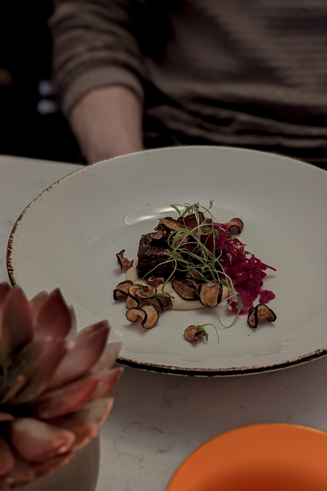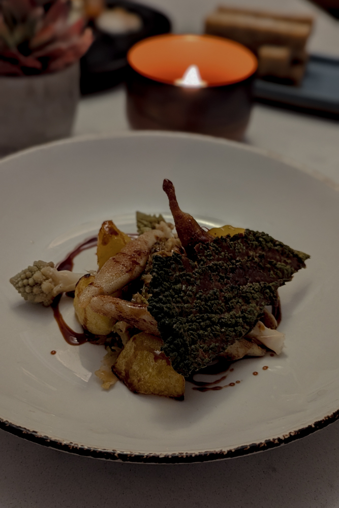 To start, I chose their Marinated Kale. Served with flamed radishes and a burned parsley crumble, this was truly moreish and a great way to start my meal. Kudos to the show-stopping spiced sweet potato ice-cream tucked in the centre – a great texture and taste sensation. My boyfriend chose the Mushroom Brisket, an aesthetically pleasing dish served on fermented red cabbage with parsnip cream and crispy salsify. This worked well too, although I personally wanted a touch more flavour on it.