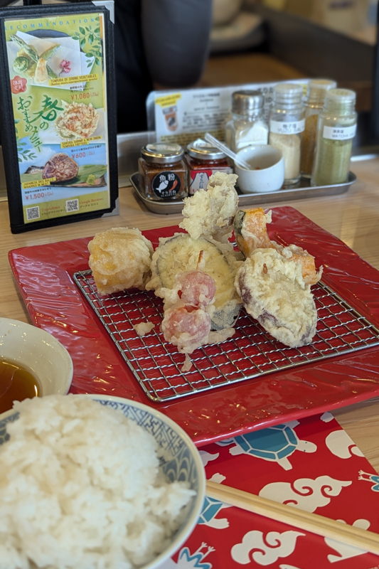 Since visibility of Mount Fuji waned by lunchtime, we grabbed lunch at Fuji Tempura Idaten, which has a few vegan options. The food was delicious, but expect to queue! Another station eki stamp later, we headed back to Tokyo in search of more views and a celebratory dinner spot.