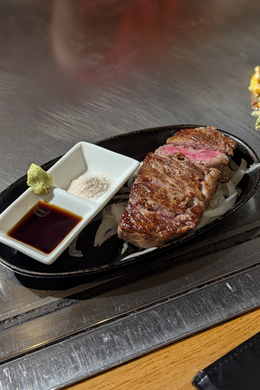 For dinner, we went to Teppan Baby, a basement teppanyaki restaurant that also has vegan options. We absolutely loved this meal: okonomiyaki on the grill and Eddie even tried A5 wagyu, all cooked to perfection on show in front of us! They even had Kewpie baby details everywhere – adorable!