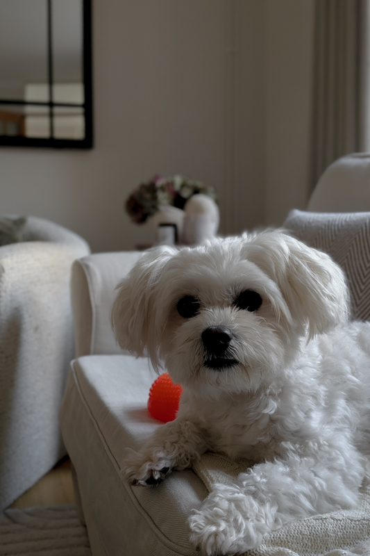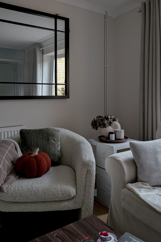 My autumn project in the house has been to ‘cosy-fy’ the living room. Coming from a family home to a bare-bones house means that it’s been a long, slow and expensive process to get us to where we were. But, I’d been itching to add a couple more décor bits before I finish (or even start) building our alcove cabinet. We bought this beautiful bouclé armchair on payday last month, and it arrived just two days later! I think it’s helped to zone in the room a little, and it’s been great for reading in.
